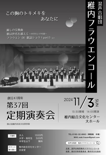 | 2024年 第37回定期演奏会 ※混声合唱団稚内フラウエンコールの公式YouTubeチャンネルで映像がご覧いただけます。 2024年11月3日(日) 14:00〜 稚内総合文化センター大ホール 指揮 梅津 理架子 ピアノ 阿部 ゆか 鈴木 さやか メインテーマ 「この胸のトキメキをあなたに」