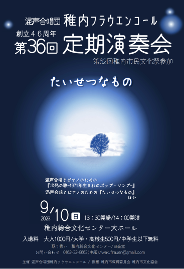 | 2023年 第36回定期演奏会 ※混声合唱団稚内フラウエンコールの公式YouTubeチャンネルで映像がご覧いただけます。 2023年9月10日(日) 14:00〜 稚内総合文化センター大ホール 指揮 梅津 理架子 ピアノ 阿部 ゆか 鈴木 さやか メインテーマ 「たいせつなもの」